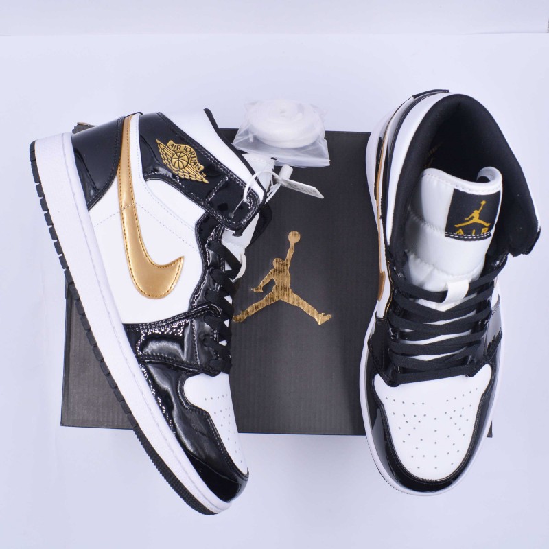 It was once sold at air jordan retailers, but the metallic gold and black air jordan i retro is long gone and is a rarity to see in marketplaces. Jordan brand is releasing a true piece of treasure, so cop the jordan 1 mid patent black white gold. Nike mens air jordan 1 retro high og nrg top 3 black/metallic gold leather size. Patent leather throughout the upper primarily indulges in a. The air jordan 1 mid metallic gold features lux golden patent leather on the toe region, eye stays, rear, and heels.