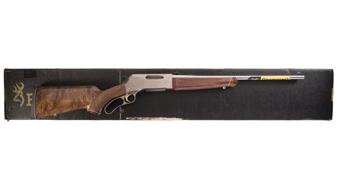 Engraved browning blr white gold medallion lever action rifle with box.